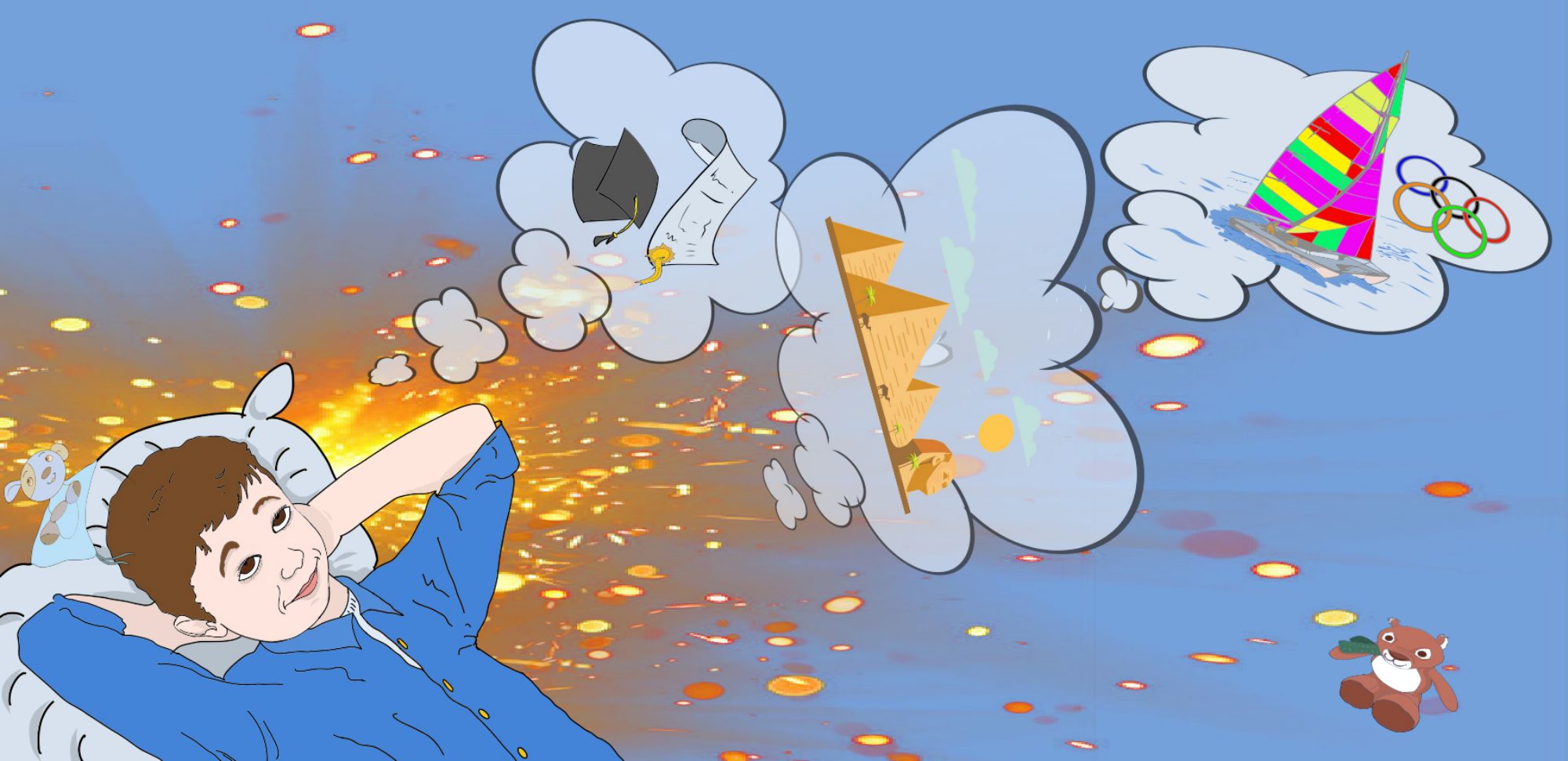 Ce comic strips raconte l'histoire d'un enfant dont les rêves s'envolent chaque jour. À l'école, il imagine devenir champion de judo, puis vedette sur scène, musicien talentueux, ou voyager à Dubaï. Entre les cours, les déménagements chaotiques et les petites aventures du quotidien, ses aspirations grandissent. En savoir plus ..